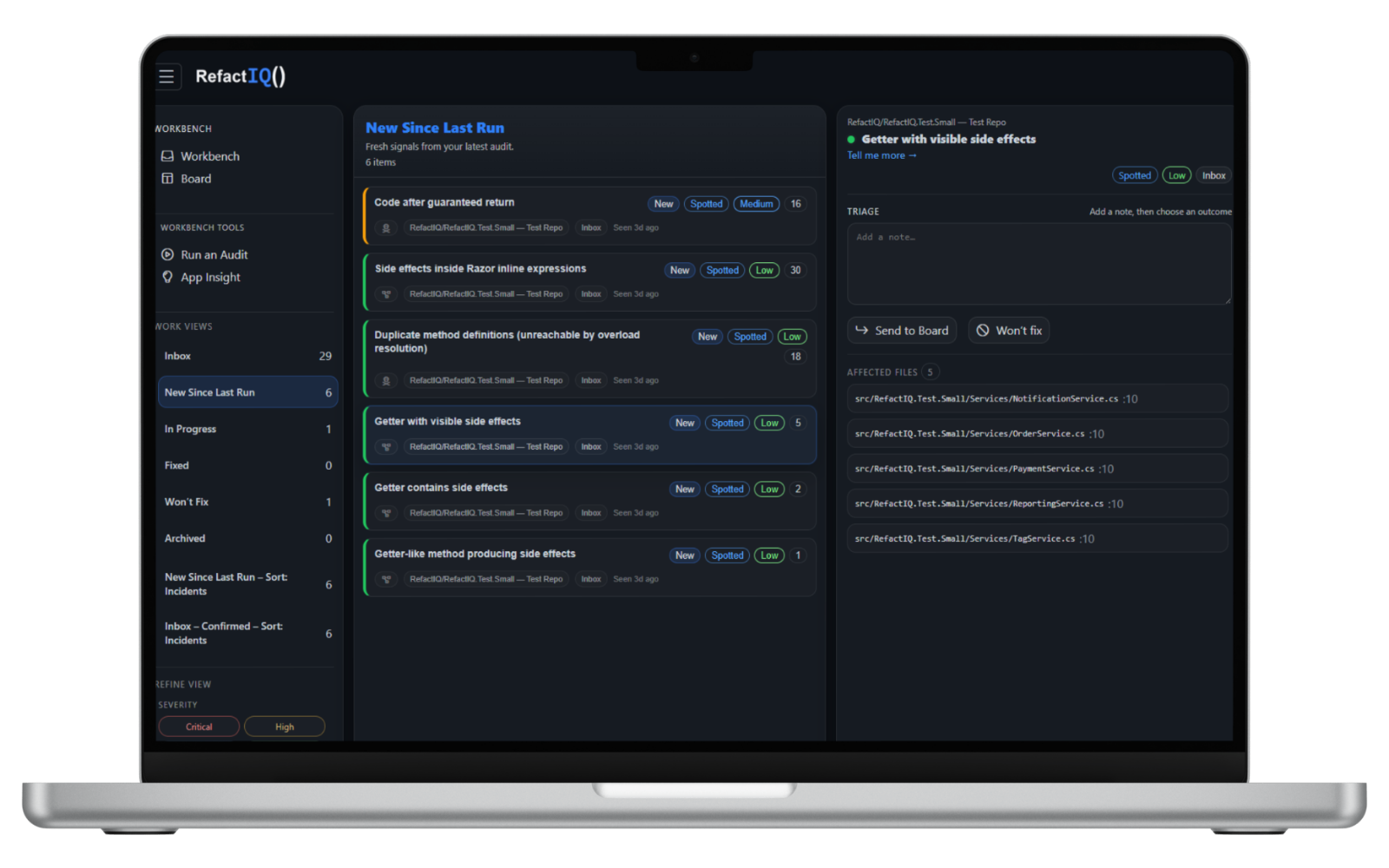 RefactIQ helps you understand what’s risky, why it matters, and what to fix next so you can keep shipping with confidence instead of hope.